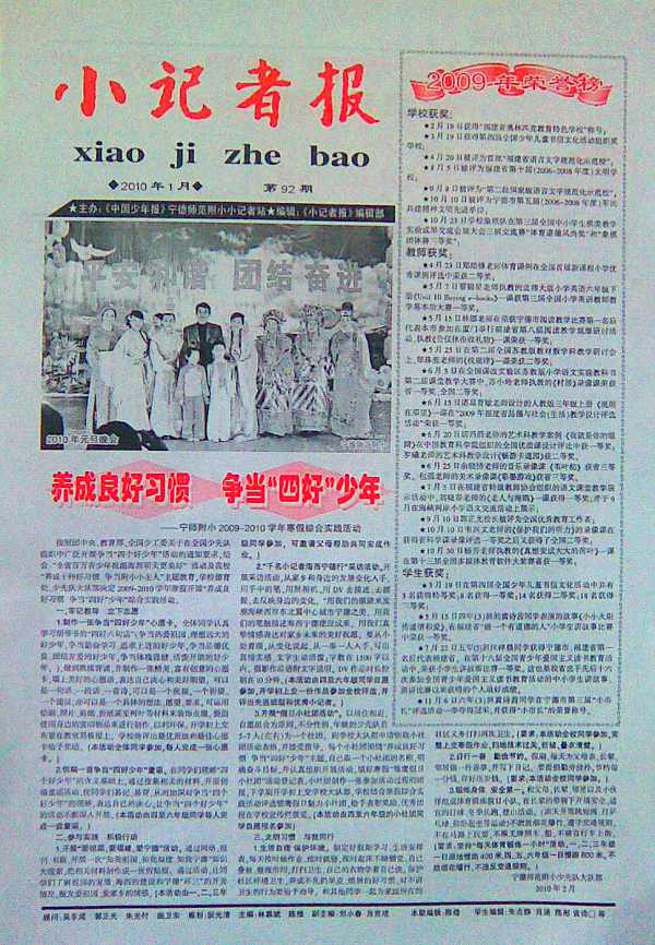 2.“千名小记者海西宁德行”采访活动。开展采访活动,从家乡和身边的发展变化入手,用手中的笔、用照相机、用DV去描述、去捕捉、去反映身边的变化。“用我们的眼睛来发现海峡西岸东北翼中心城市宁德之美,用我们的笔触描述海西宁德建设成果,用我们真挚情感表达对家乡未来的美好祝愿。要从小处着眼,从变化说起,从一事一人入手,写出真情实感,文字生动活泼;字数在1500字以内。摄影作品请附文字说明。DV作品时长控制在l0分钟。(本活动由四至六年级同学自愿参加,开学初上交一份作品参加全校评选,并评出先进班级和优秀小记者。)