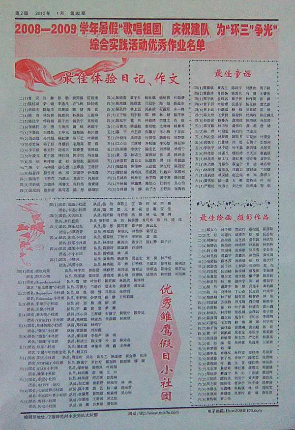 1.开展“爱祖国、爱福建、爱宁德”活动。通过网络、报刊、书籍,开展一次“知我祖国、知我福建、知我宁德”知识大搜索,把相关材料制作成一张剪贴报。通过活动,让同学们了解祖国的发展、海西的建设和宁德“环三”的开发情况,激发爱祖国、爱家乡的情感。(本活动由一、二、三年级同学参加,可邀请父母帮助共同完成作业。)