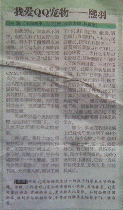 宁德网消息(宁师附小六(3)班 肖涵) 说起宠物,大家都不陌生,有的人养了机灵好动的小狗;有人养了慵懒调皮的猫咪;甚至有人养了嘶嘶作响的蟒蛇……而我的宠物熙羽十分特殊,它是“虚拟”的Q宠。