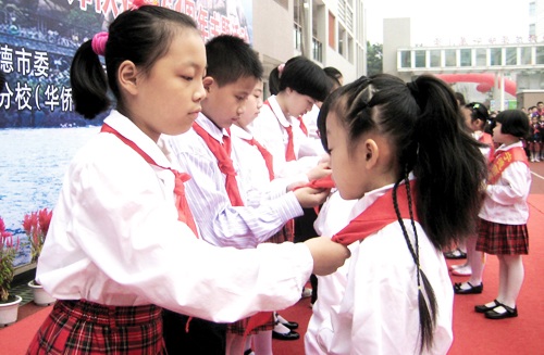 活动中,全体少先队员在党旗、团旗、队旗下,双手捧起胸前的红领巾诵读“争当四好少年”的要求。同学们表示,作为一名少先队员感到十分自豪,更要以争当“四好少年”来要求自己,热爱学校、热爱宁德,立志为环三都澳建设和宁德跨越发展,勤学习、尽责任、做贡献。图为当日宁师附小高年级少先队员为一批新少先队员佩戴红领巾。 | | |