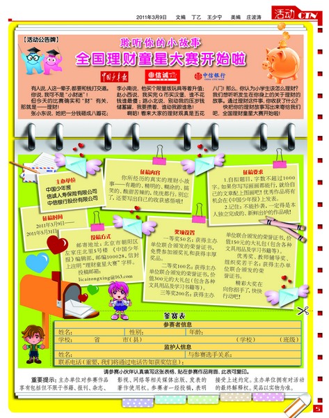 有人说,人这一辈子,都要和钱打交道。你说,我可不是“小财迷”!但今天的比赛确实和“财”有关,那就是——理财!张小东说,她把一分钱砸成八瓣花;李小南说,他买个限量版玩具等着升值;赵小西说,我买完Q币买汉堡,谁不花钱谁最傻;路小北说,别动我的压岁钱储蓄罐,我要攒着,谁动我跟谁急!啊哈!看来大家的理财观真是五花八门!那么,你认为小学生该怎么理财?我们想听听发生在你身上的关于理财的故事。通过理财这件事,你收获了什么?快把你的理财故事写出来寄给我们吧,全国理财童星大赛开始啦!主办单位:中国少年报 信诚人寿保险有限公司 中信银行股份有限公司征稿时间:2011年3月9日——2011年5月31日征稿内容:你所经历的真实的理财小故事——有趣的、精明的、糊涂的、搞笑的、酸甜苦辣的,统统都行。别忘了,还要写出自己的收获感悟哦!征稿要求:1.自拟题目,字数不超过1000字。如果你写写画画都能行,就给自己的文章配上图画吧!优秀作品将有机会在《中国少年报》上发表。2.记住:不能抄袭,一定得是本人独立完成的、新鲜出炉的作品哦!投稿方式:邮寄地址:北京市朝阳区左家庄北里5号楼 《中国少年报》编辑部,邮编100028,信封上注明“理财童星大赛”字样。集体参赛的学校由学校统一邮寄。奖项设置:一等奖50名:获得主办单位联合颁发的荣誉证书,免费参加颁奖礼和获得丰厚奖品。二等奖100名:获得主办单位联合颁发的荣誉证书,价值300元的大礼包(包含各种文具用品及学习书籍等)。三等奖200名:获得主办单位联合颁发的荣誉证书,价值150元的大礼包(包含各种文具用品及学习书籍等)。优秀奖、教师辅导奖、组织奖若干名:获得主办单位联合颁发的荣誉证书。精彩大奖在向你招手了,快快行动吧!请参赛小伙伴认真填写这张表格,贴在参赛作品背面。