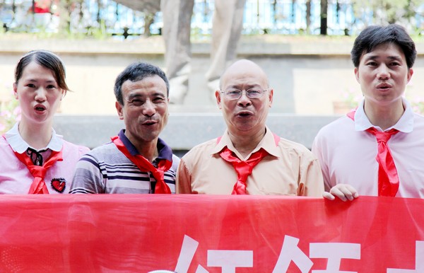 在横幅前红领巾和余老师一齐合唱“我们从这里扬帆启航”,大队长江心田、大队委林江芳等一个个献上队礼,送上祝福,感谢余老师的关心爱护。辅导员老师给余伯伯敬一个队礼,一个拥抱,都深深表达了对老少先队工作者的尊敬与爱戴。