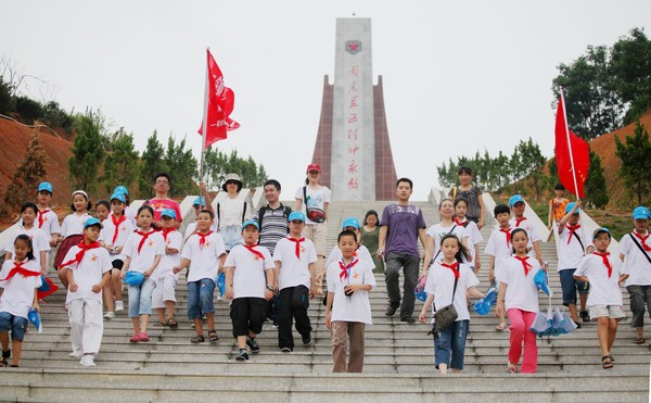 来到柏柱洋,我们不能不去看建于50年代的柏柱洋“红领巾水库”。雷锋飞老师说:“在纪念馆后山,只要登上340层台阶,站在高高矗立的“闽东苏区纪念碑”前就能看见“红领巾水库”全貌了。这340层台阶又有纪念闽东苏区创建于1934年的寓意。”登山揽胜,这可是一举双得啊!于是,在“学习先辈,勇攀高峰,以我所能尽责任”口号声中,队员们列队开始登攀了。营旗在前方引路,随着,1、2、3……340的数数声,很快,全员登上纪念碑前广场,往碑上看,“闽东苏区精神永放光芒”10个大字闪闪发光,往下看,整个柏柱洋尽收眼底。孩子们欢呼,欢笑!为自己登顶而兴奋。
