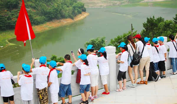 纪念碑右侧有一弯湖水,那就是“红领巾水库”,只见坝上有几辆挖掘机正在工作,老师们介绍说,那是加固水库的工程正在进行着。再往远处盼望,红领巾水库的纪念碑、纪念亭掩映在绿草丛中。我把摄影机换上长焦镜头,拍下红领巾水库及周边纪念亭等景物,打开观赏镜让孩子排队仔细观看。“老师,不会是骗我们吧?我怎么看不见‘红领巾水库’的字啊?”孩子们提出了带有挑战性的话语了,他们要近距离看看“红领巾水库”景物啊!